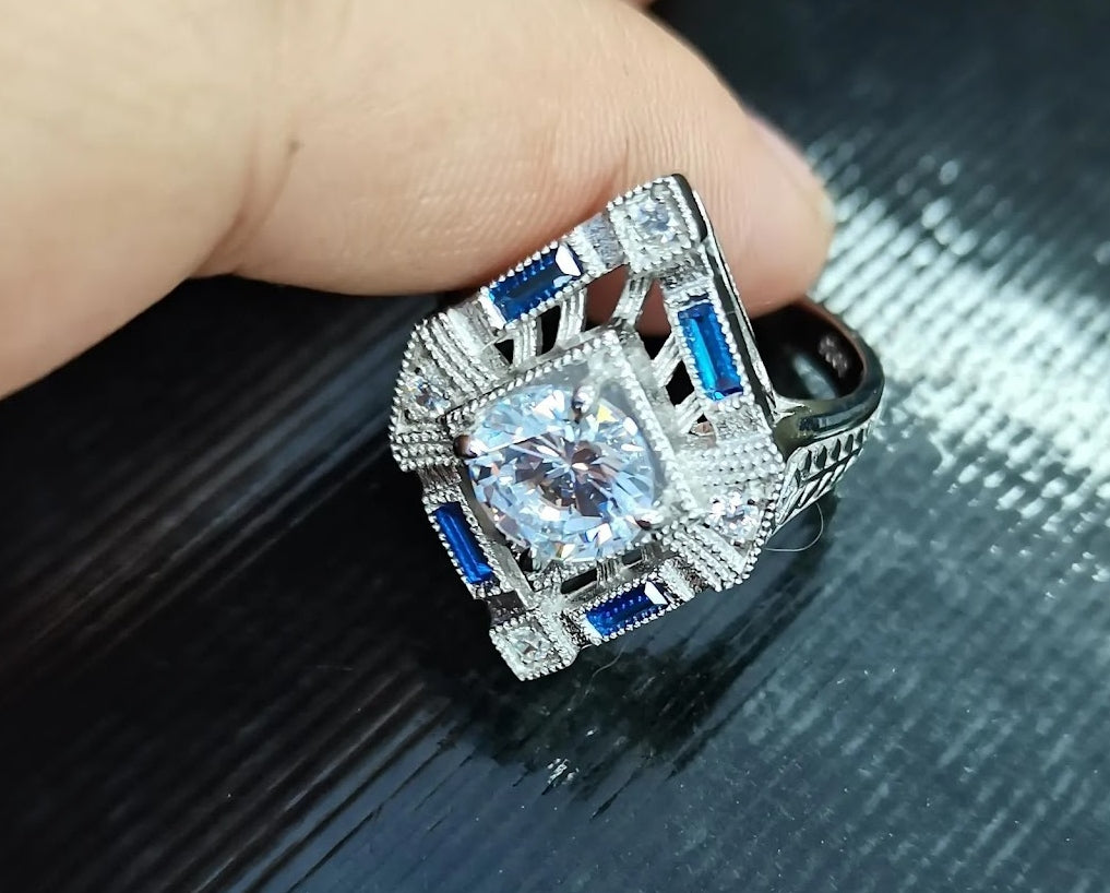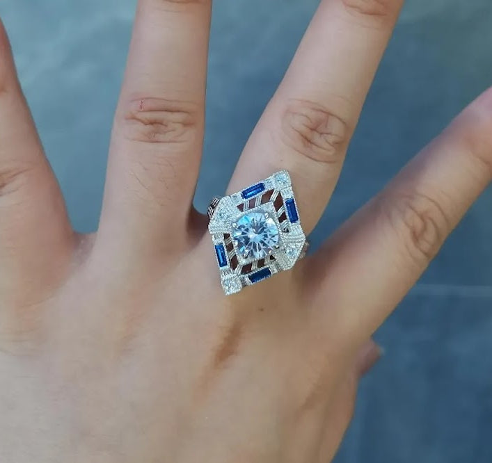 Inspired by vintage glamour, this 3-carat round-cut blue sapphire engagement ring captures the essence of Art Deco elegance. The sapphire’s vivid blue tone is beautifully framed by geometric detailing and accent stones that add brilliance and dimension. With its bold, architectural design and timeless sparkle, this ring is perfect for someone who loves a mix of classic charm and statement-making style.