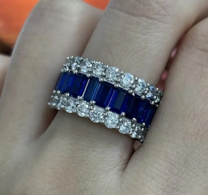 This exquisite eternity band features a stunning row of deep blue emerald-cut sapphires framed by two sparkling rows of round-cut diamonds. The combination of vivid sapphire blue and brilliant white diamonds creates a timeless, luxurious look. Perfect for weddings, anniversaries, or as a statement of refined elegance, this ring captures sophistication and beauty in every angle.