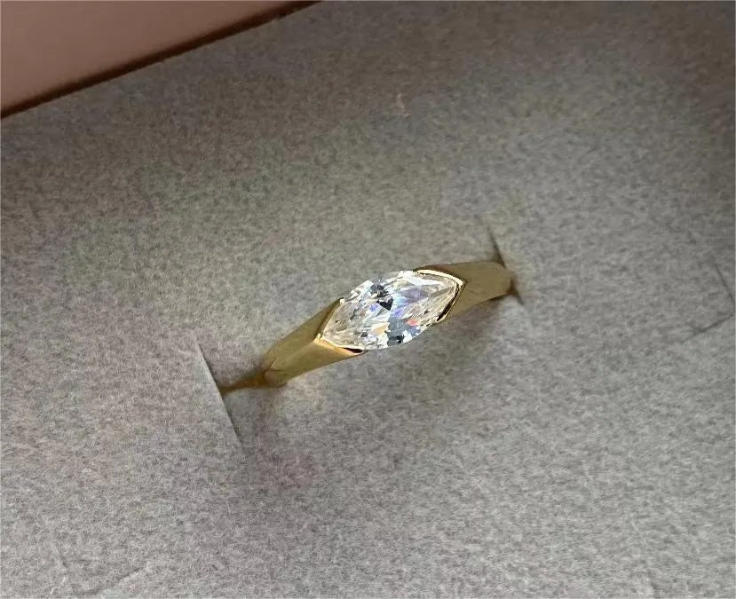 This ring features a stunning 2-carat marquise-cut white sapphire set in a sleek, timeless gold band, exuding understated sophistication and romance. The elongated shape of the marquise-cut stone gives the ring a graceful and flattering look, while the white sapphire provides a brilliant, shimmering alternative to traditional diamonds. Ideal for weddings, anniversaries, or special milestones, this eternity ring captures classic beauty with a modern twist—perfect for anyone who appreciates elegance and lasting style.