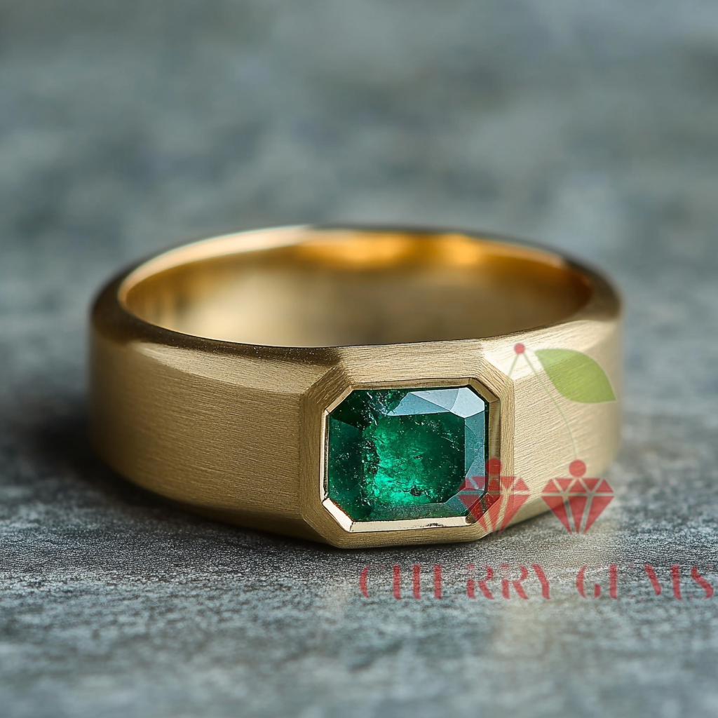 This stunning ring features a bold, wide band crafted from 18K gold, exuding a luxurious and timeless appeal. At its heart lies an octagon-cut Colombian emerald, beautifully set into the band, adding a rich green hue that contrasts elegantly with the golden base. The emerald’s deep color and the ring’s sleek, brushed finish create a perfect harmony, making it an ideal piece for those who appreciate refined elegance with a touch of modern sophistication.