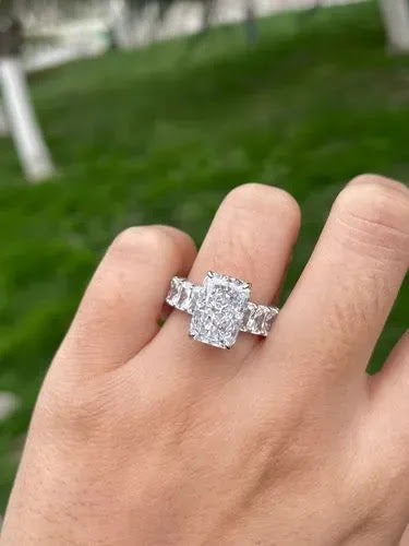 This stunning engagement ring features a brilliant 5-carat radiant-cut white sapphire that sparkles with incredible clarity and fire. Set in a sleek band adorned with matching side stones, it captures timeless beauty and modern elegance. The radiant cut enhances the sapphire’s natural brilliance, making it a perfect choice for those who love a bold yet refined look.