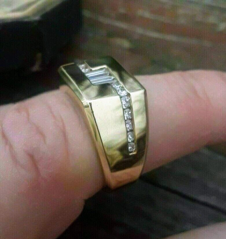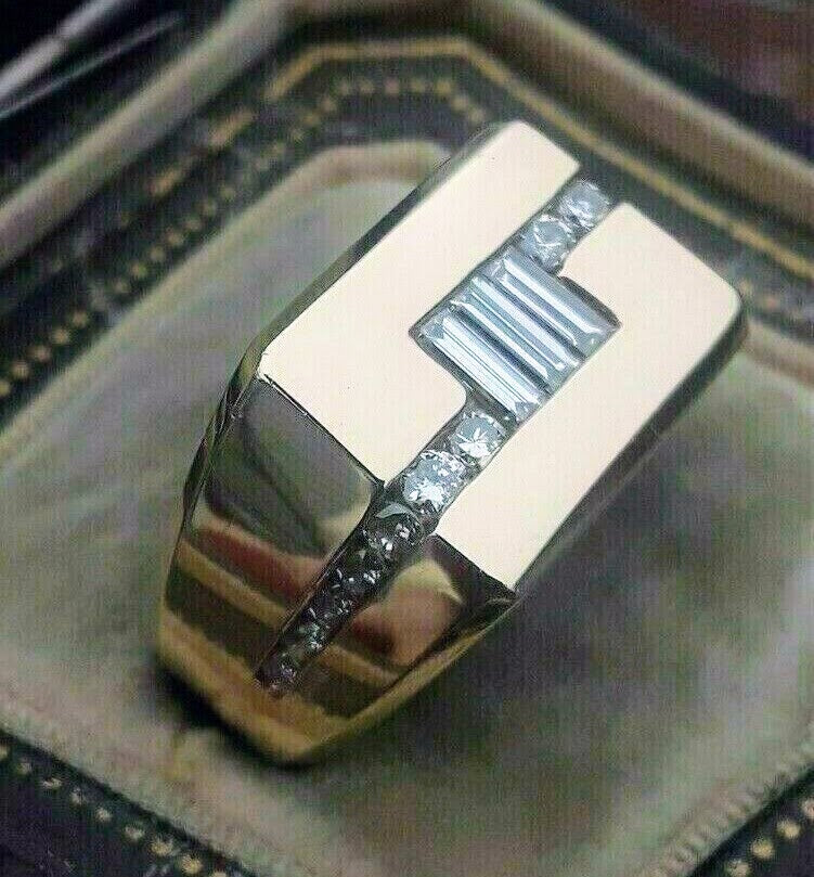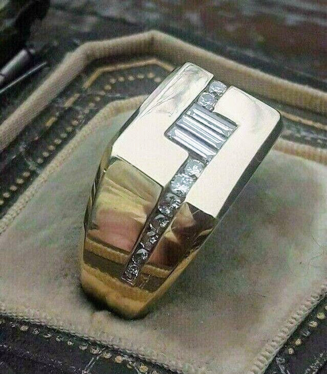 Elevate your style with this luxurious men's gold ring, masterfully crafted to embody geometric precision and sophistication. The bold, rectangular face of the ring is elegantly adorned with a series of baguette-cut diamonds, centrally aligned to draw the eye with their radiant sparkle. Flanking these diamonds, a channel of smaller round diamonds adds an extra layer of brilliance, accentuating the modern design. Perfect for the discerning gentleman, this ring is a statement piece that combines strength with refined elegance, making it an ideal choice for both special occasions and everyday wear.