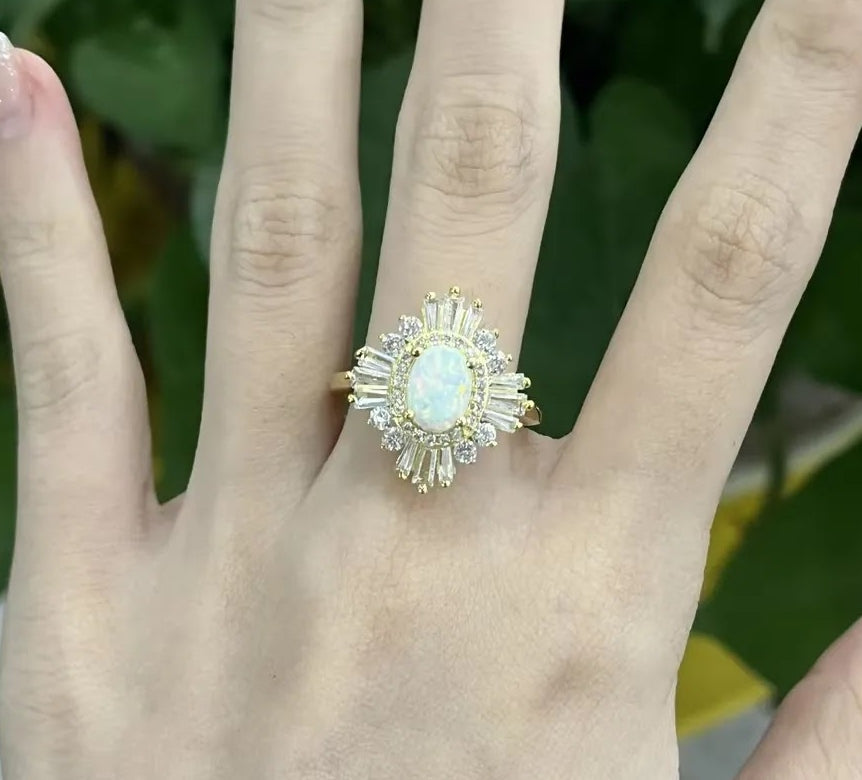 The central opal is exquisitely framed by a dynamic, multi-layered halo. An inner circle of brilliant white sapphires intensifies the opal's ethereal glow, while an outer burst of elegant baguette-cut white sapphires and delicate smaller opals radiates outward like sun rays, creating a breathtaking and intricate starburst effect. The entire opulent display is meticulously set in a gleaming gold band, which beautifully complements the warm hues of the opals and adds a touch of timeless luxury.