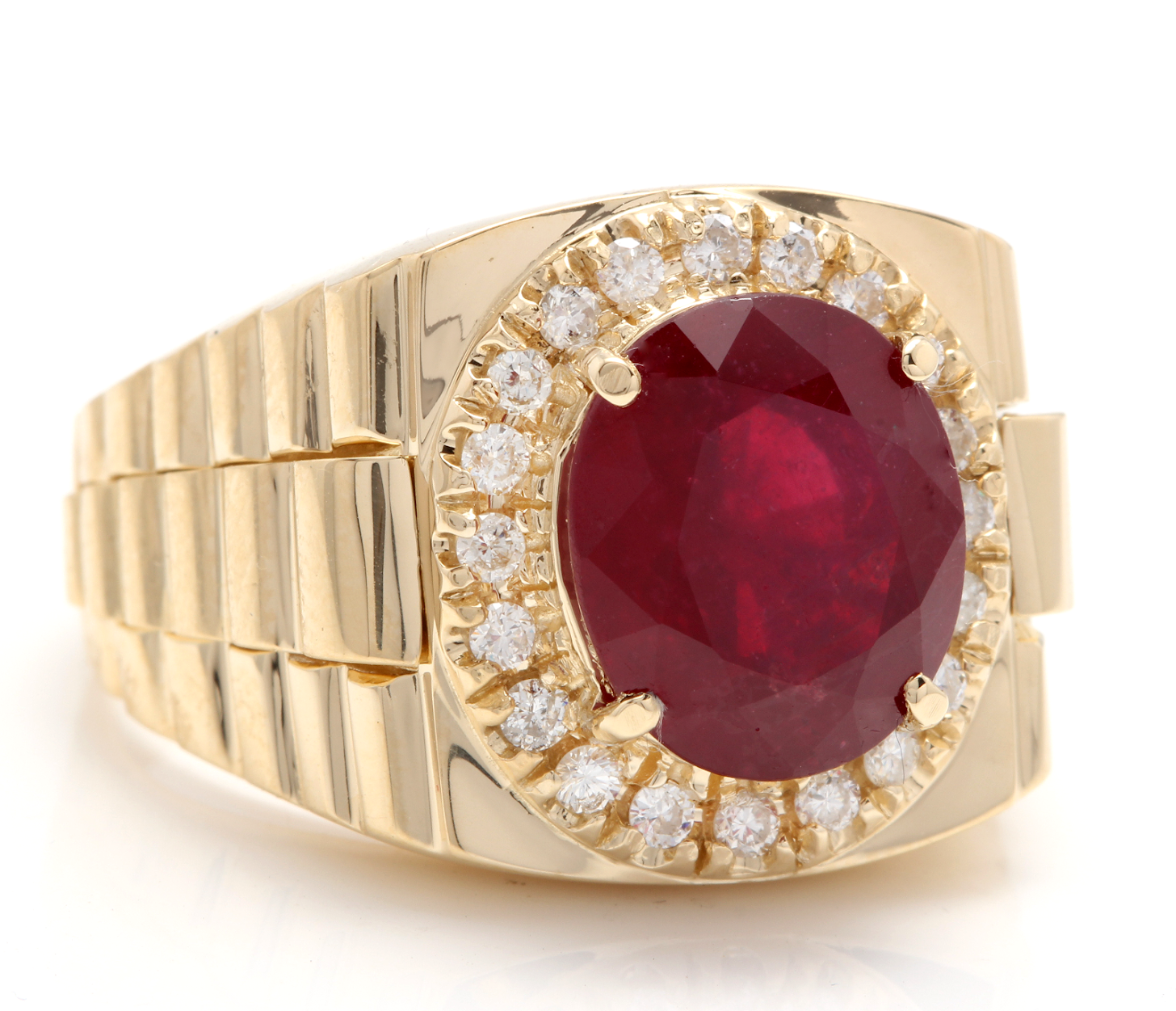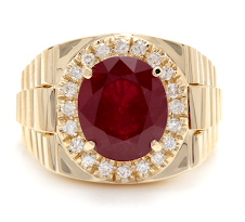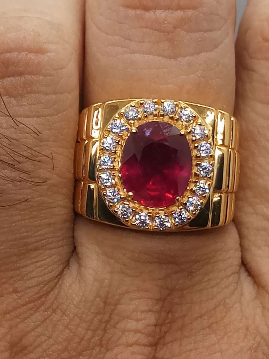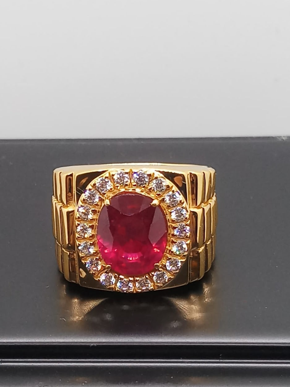 - Striking Design: At the heart of this ring is a stunning red ruby, surrounded by a sparkling halo of white stones. This eye-catching combination creates a look that’s both powerful and sophisticated.