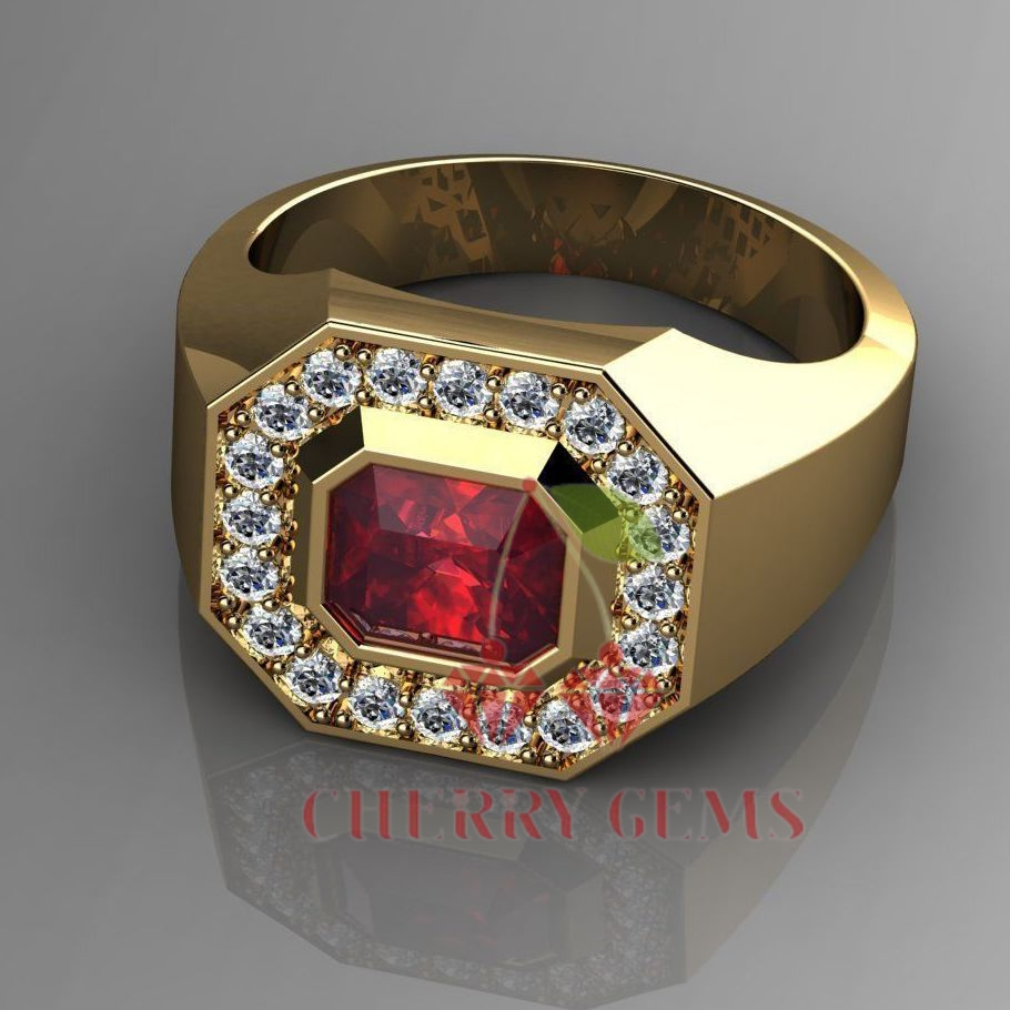 This ring features a stunning natural ruby at its center, radiating a deep, passionate red. Surrounding the ruby are sparkling white diamonds with high quality micron 18k yellow gold plated that catch the light beautifully, adding a touch of brilliance to your style.