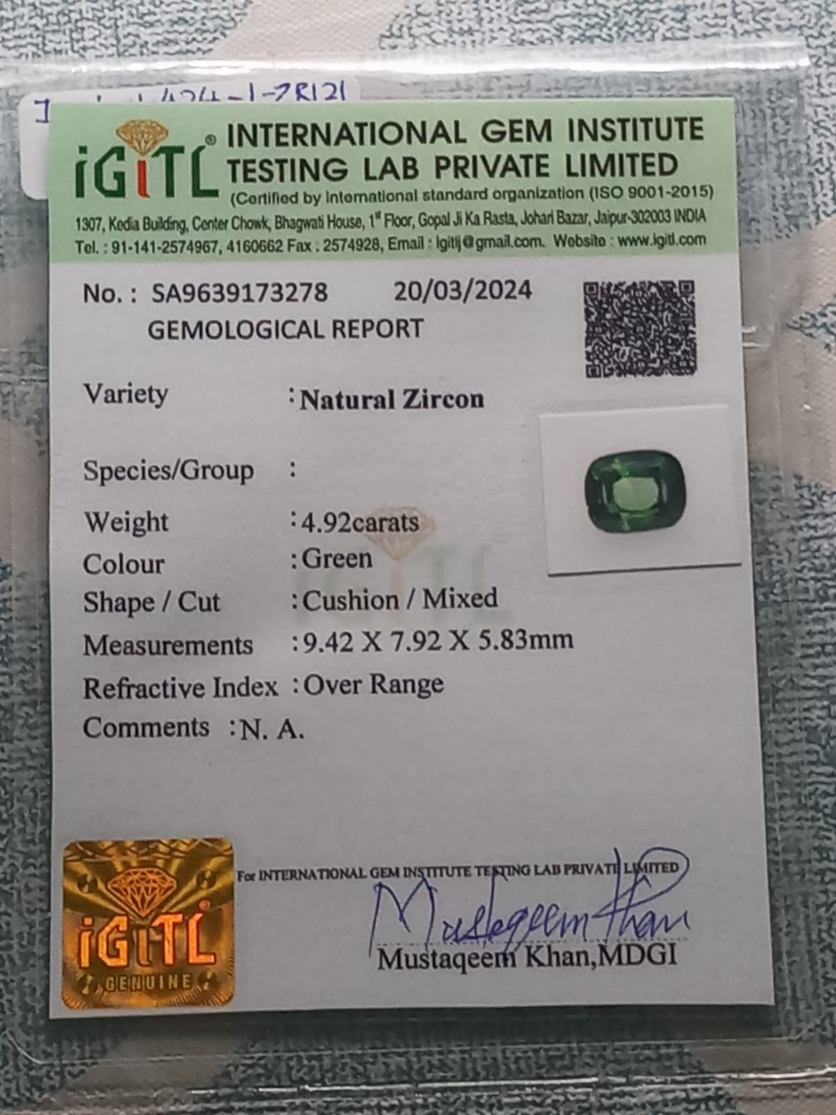 Natural Certfied Green Zircon: Green Perfection 4.92cts- ZR119