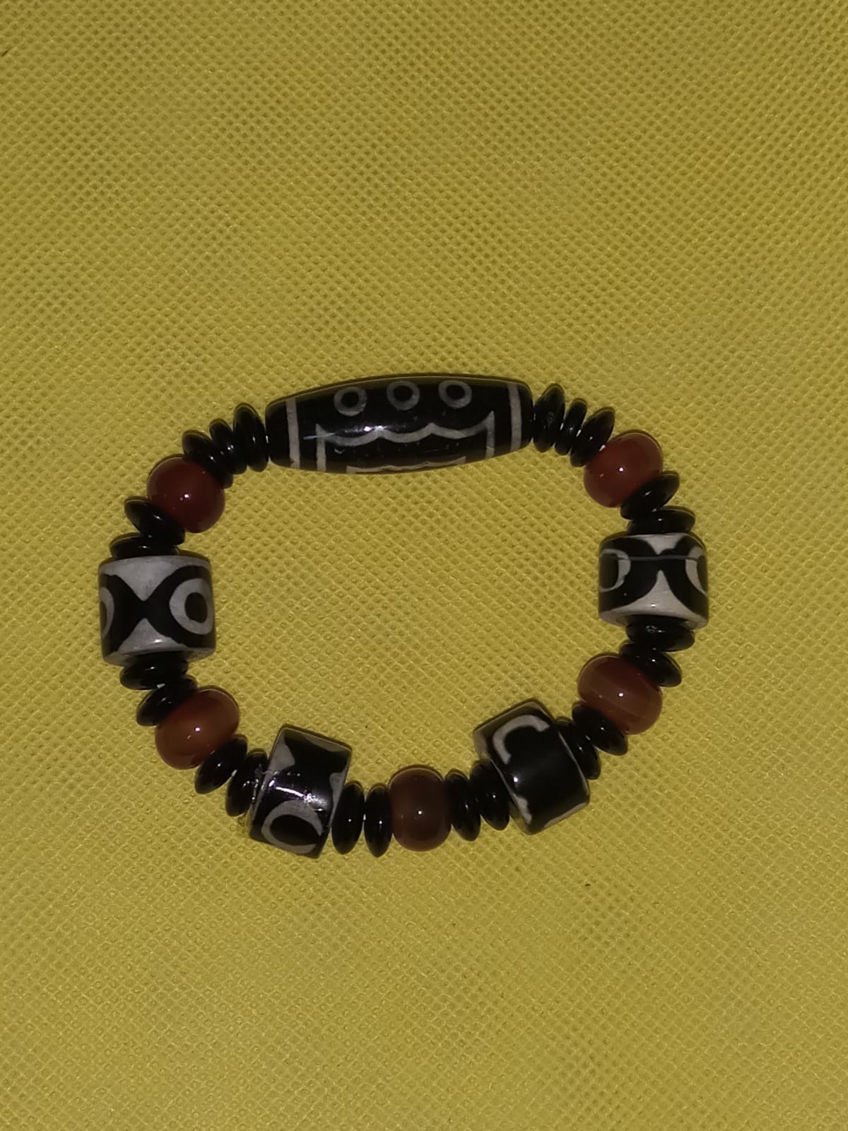 Dzi bracelets are made from agate and are traditionally worn as charms or accessories in Tibetan and Himalayan cultures. These bracelets have cultural and symbolic significance, representing various spiritual beliefs and traditions. Dzi bracelets are adorned with decorative symbols that can include circles, ovals, squares, waves or zig zags, stripes, lines, diamonds, dots, and other archetypal patterns. These bracelets can be worn on the wrist as a bracelet, as a pendant on a necklace, or carried as a keychain or in a wallet. They are often cherished for their unique patterns, craftsmanship, and cultural significance. Many people simply wear dzi bracelets for their aesthetic appeal and as a way to connect with the rich heritage and symbolism they represent.