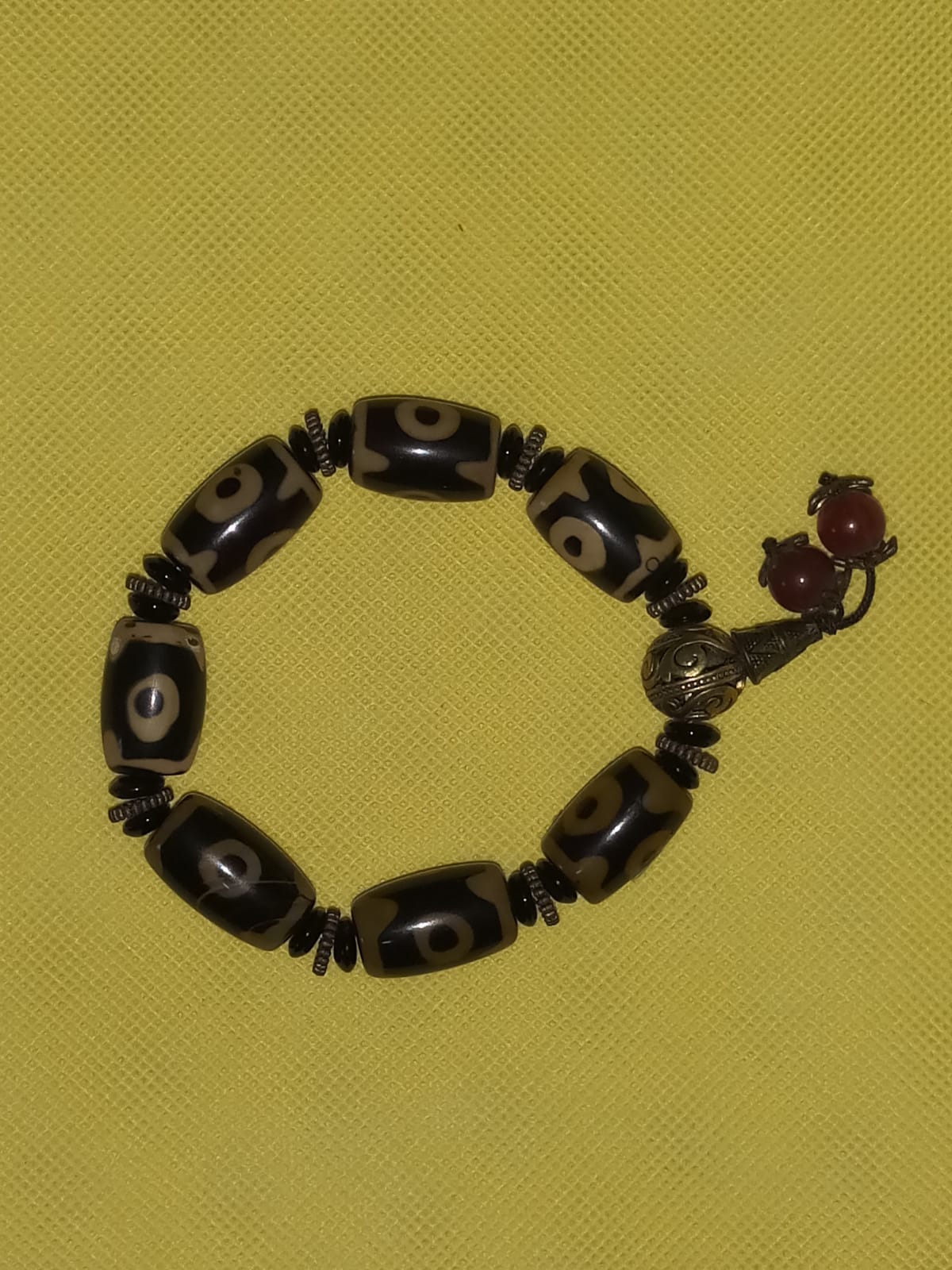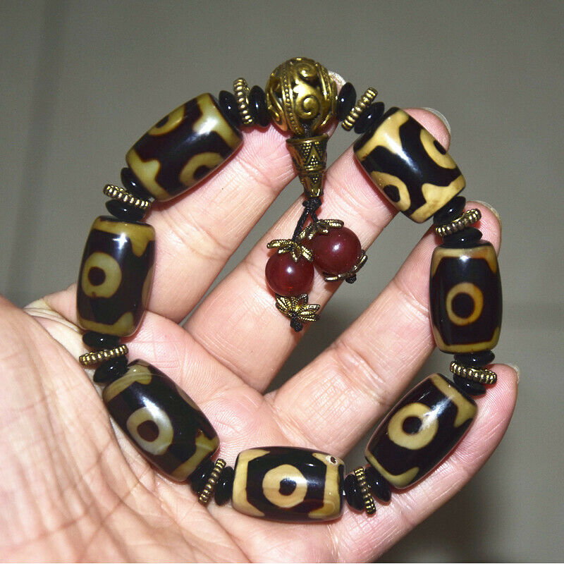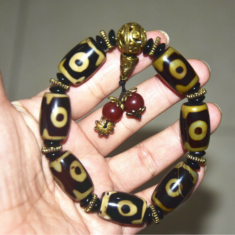 Dzi bracelets are made from agate and are traditionally worn as charms or accessories in Tibetan and Himalayan cultures. These bracelets have cultural and symbolic significance, representing various spiritual beliefs and traditions. Dzi bracelets are adorned with decorative symbols that can include circles, ovals, squares, waves or zig zags, stripes, lines, diamonds, dots, and other archetypal patterns. These bracelets can be worn on the wrist as a bracelet, as a pendant on a necklace, or carried as a keychain or in a wallet. They are often cherished for their unique patterns, craftsmanship, and cultural significance. Many people simply wear dzi bracelets for their aesthetic appeal and as a way to connect with the rich heritage and symbolism they represent.