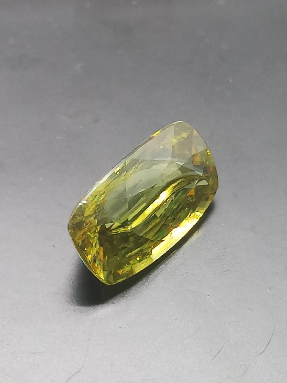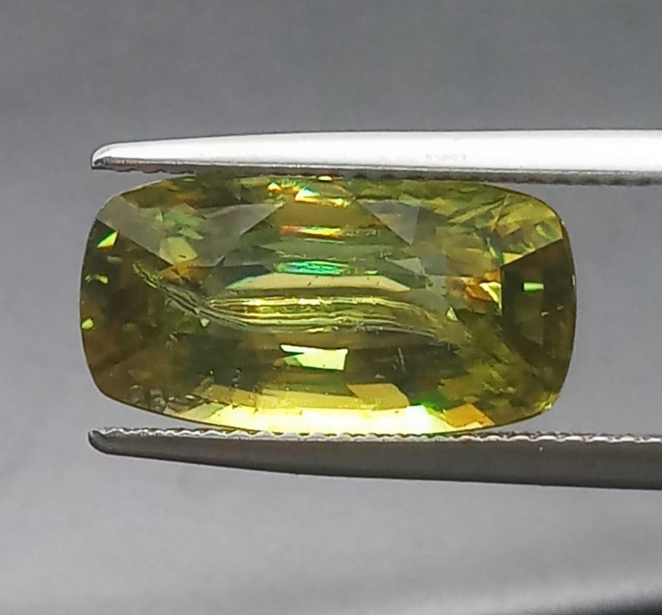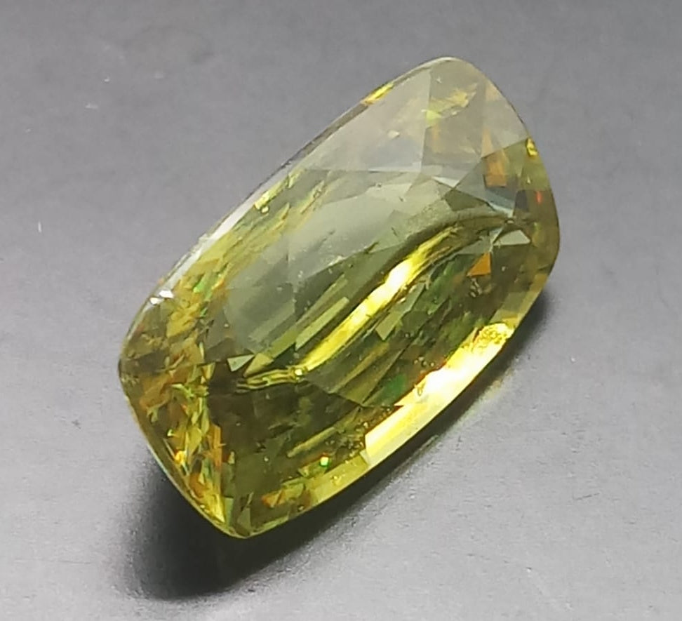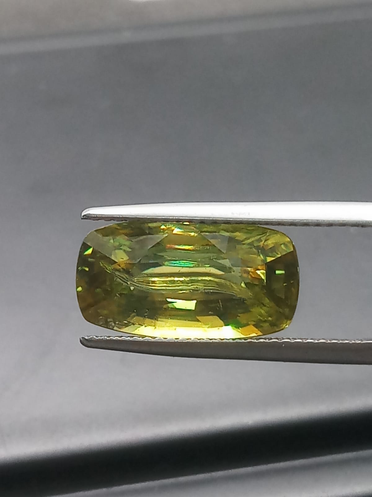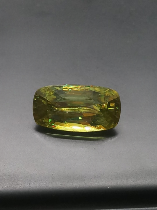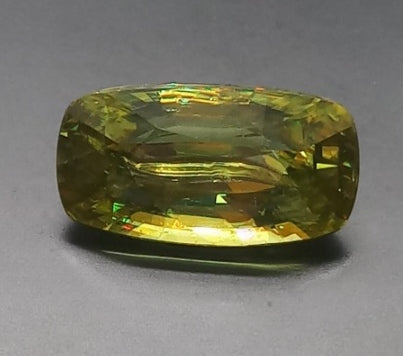 Sphene, a calcium titanium nesosilicate mineral, exhibits an exceptionally high level of dispersion. This means that it can break up white light into its spectral colors even more intensely than diamond. This strong "fire" and brilliance make well-cut sphene gemstones highly prized for their rainbow-like flashes of color.