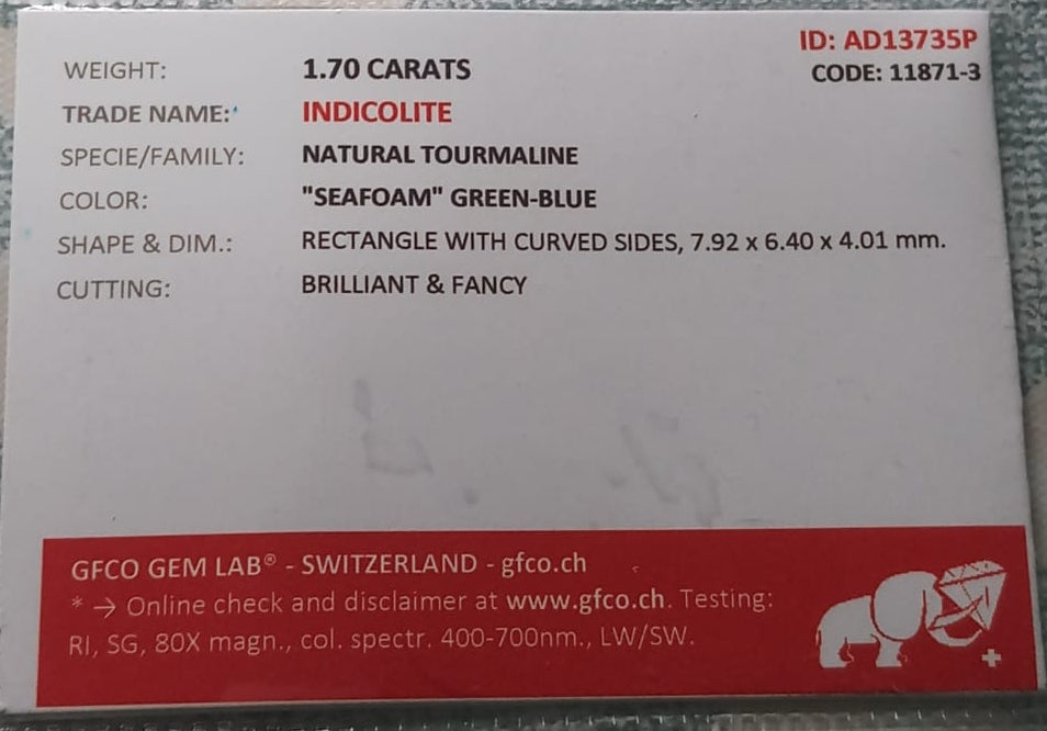 Natural Swiss Lab Certified Certified Tourmaline: Indicolite Tourmaline 1.7cts- T1 (24)
