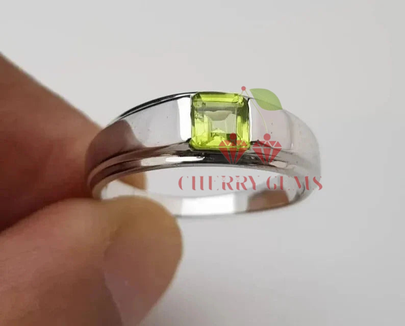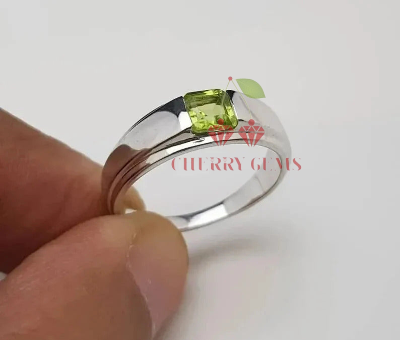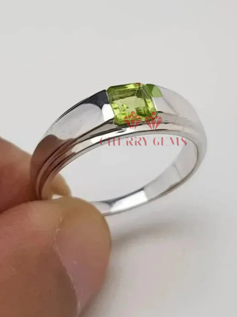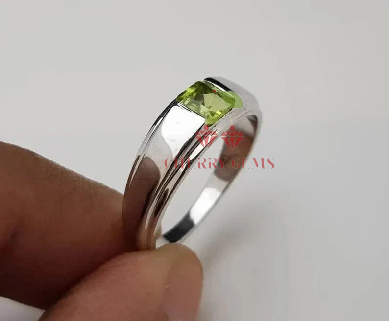 a minimalist marvel designed for those who appreciate understated elegance. This ring features a single, captivating peridot at its center, radiating a fresh green hue that embodies nature's vitality. The gem's clean lines and brilliant cut are perfectly complemented by the sleek, polished band, creating a seamless blend of modern design and timeless appeal. Whether worn alone or paired with other pieces, this ring adds a touch of refined sophistication to any outfit. Ideal for everyday wear or as a distinctive gift, the Sleek Peridot Solitaire Ring is a testament to the beauty of simplicity and the power of a single, stunning gemstone.