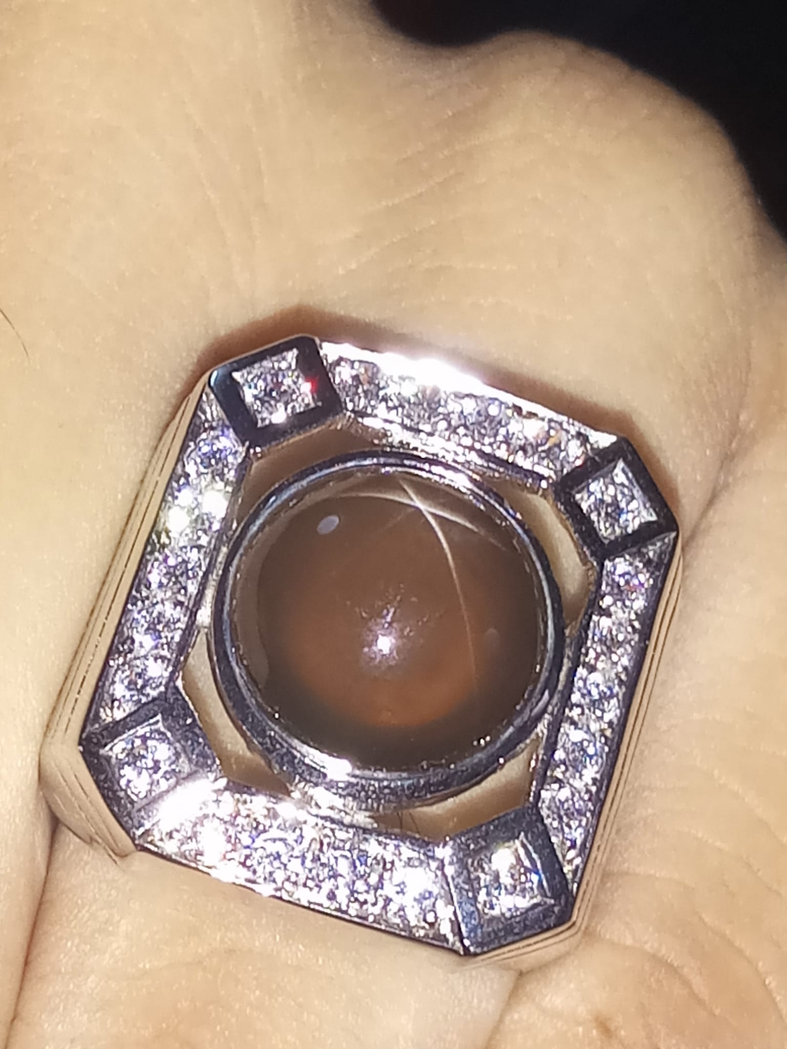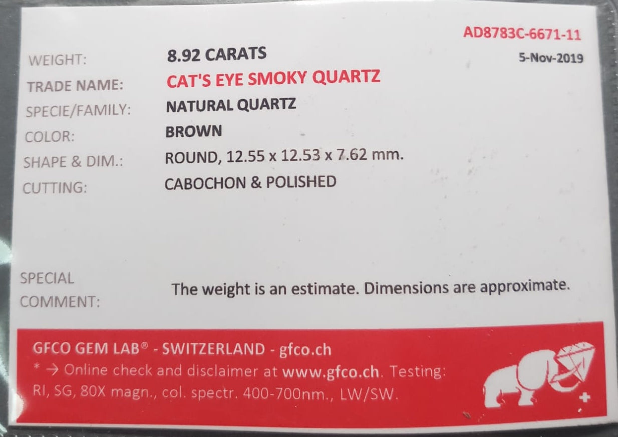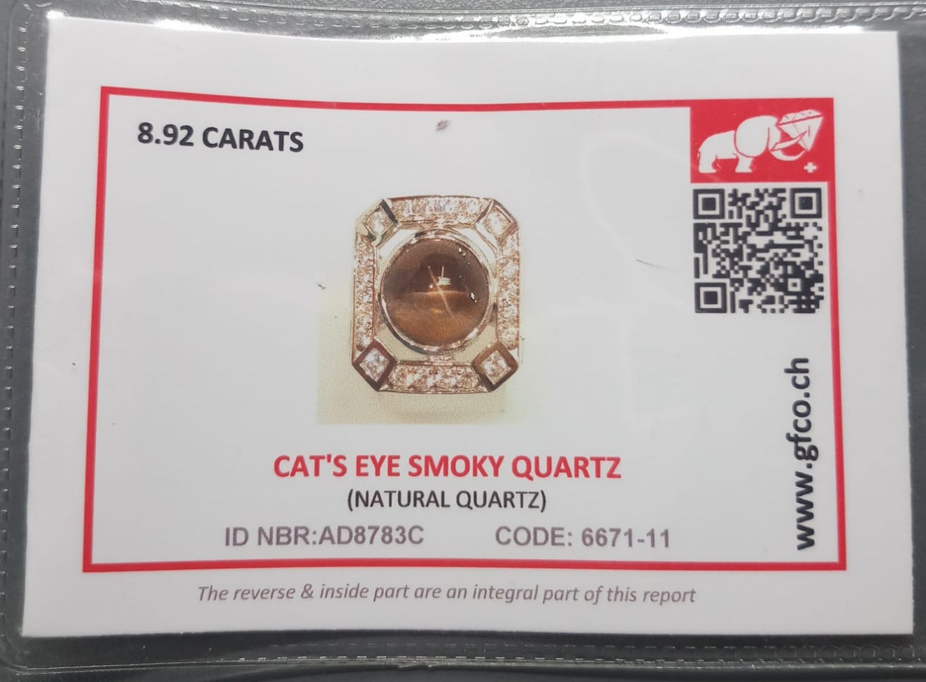 Natural SWISS LAB CERTIFIED RING with Cats Eye Smoky Quartz (SIZE 10) SR72