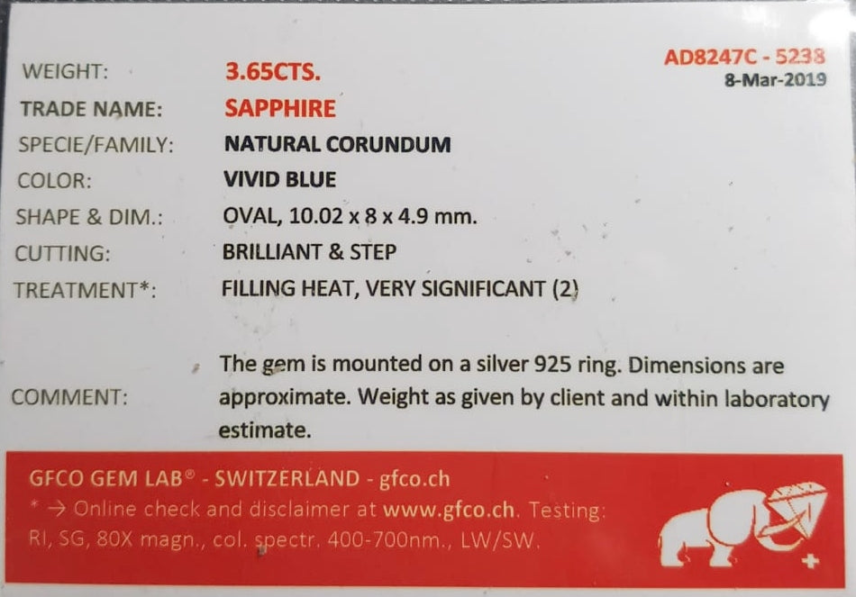 Natural SWISS LAB CERTIFIED RING with Sapphire (SIZE 10) SR60
